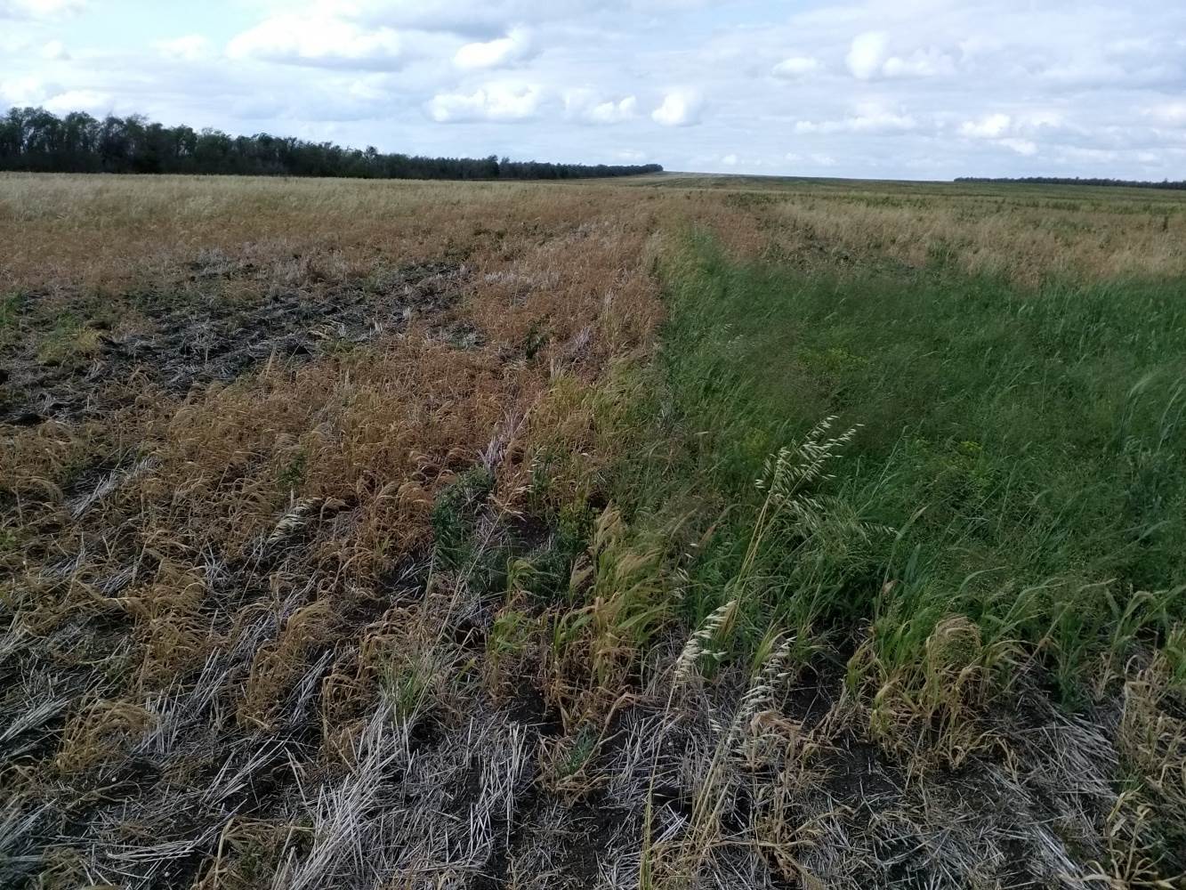 Данные препараты применялись в небольших концентрациях: Глифид — 1 л/га + Рапира — 0,2 л/га. Как видно из фотографии даже такие маленькие концентрации дали хороший положительный результат. На фотографии запечатлен участок поля, где не вовремя включили опрыскиватель, и это наглядно демонстрирует разницу между обработанным и не обработанным участком.