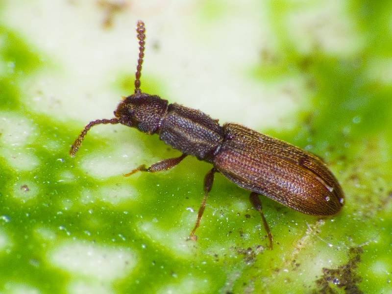 Имаго. Тело длиной от 2,0 до 3,5 мм; вытянутое и плоское, цвет от желто-бурого до черно-бурого цвета; поверхность матовая, покрыта короткими прилегающими к поверхности тела волосками. Голова направлена вперед, приплюснутая. Усики не длинее половины тела и слабо утолщающиеся к концу к концу в виде трехчлениковой булавы.