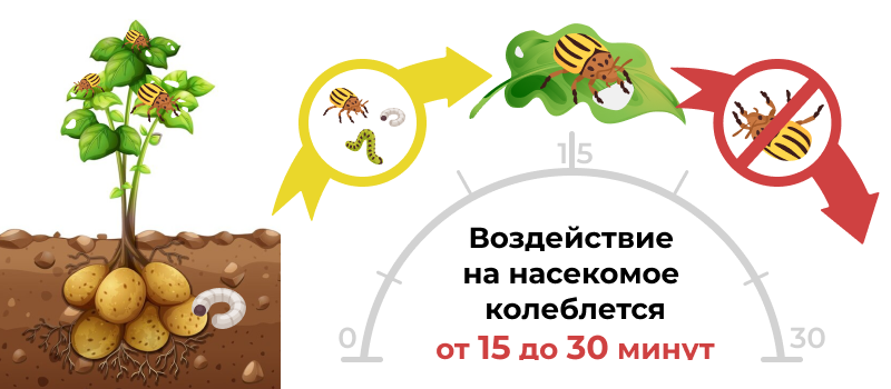 Проникает в растение через листья в течение первых часов после опрыскивания, обеспечивает быстрое уничтожение вредителей. Скорость воздействия на насекомое колеблется от 15 до 30 минут.