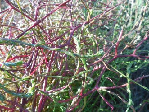 Всходы серовато-зеленые, поскольку листья покрыты мелкими белыми разветвленными, часто собранными в пучки тонкими волосками. Подсемядольный участок цилиндрический, грязно-фиолетовый, постепенно переходящий в тонкий корешок нитевидной формы. Надсемядольное междоузлие волосистое, синеватое, 5 — 6 мм длиной. Семядоли почти нитевидные с островатыми верхушками, слегка сросшиеся в основаниях. Размер 20 — 25×1 мм. Первые листья супротивные, сходны с семядолями. Третий и четвертый — появляются практически одновременно, растут быстро, сильно сближены, кажутся супротивными. Последующие листья узколинейные, похожи на первые, но немного шире и длиннее. (Васильченко И.Т., 1965)